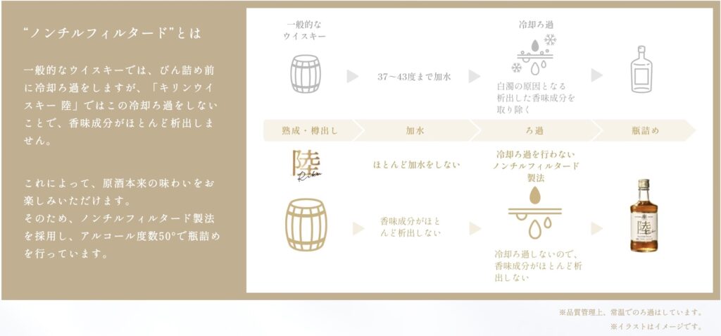 一般的なウイスキーでは冷却ろ過により香味成分が一部除去されますが、「陸」はチルフィルターを通さない製法により、原酒の旨味や香り成分をそのまま瓶詰めしています 。