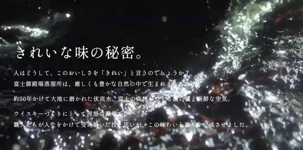 蒸留所では、富士山東斜面に降った雨水が約50年かけて濾過されたやわらかで「ミネラル豊富な伏流水」を、地下100mから、汲み上げウイスキーづくりの全工程で使用しています。この水は有機物が非常に少なく、繊細な香りと雑味のない「クリーン&エステリー」な味わいを生み出します。
